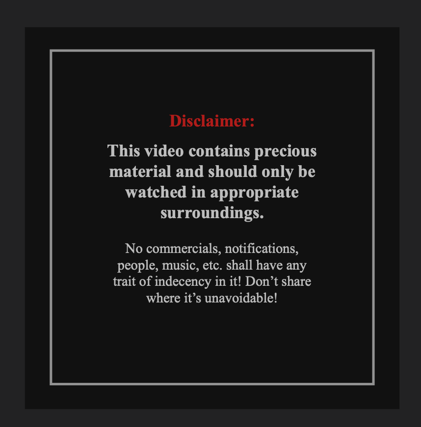 Dieses Video enthält wertvolles Material und darf nur in angemessenen Umgebungen angeschaut werden. Keine Werbung, Benachrichtigungen, Personen, Musik, etc. dürfen irgendwelche unangemessenen Spuren aufweisen! Teilt es nicht, wo dies unvermeidlich ist!